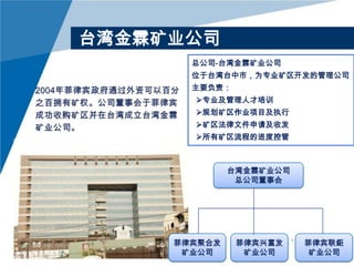 台湾金霖矿业公司负责开发菲律宾东萨马省的007矿区,面积为3757公顷,主要矿藏包括镍、钴、铁等。菲律宾在金属矿产储量中排名第三,具有丰富的矿产资源和优越的地理位置,特别适合国际市场的运输需求。该公司还计划在矿区进行可持续开采和植被复耕,致力于资源的经济价值最大化。