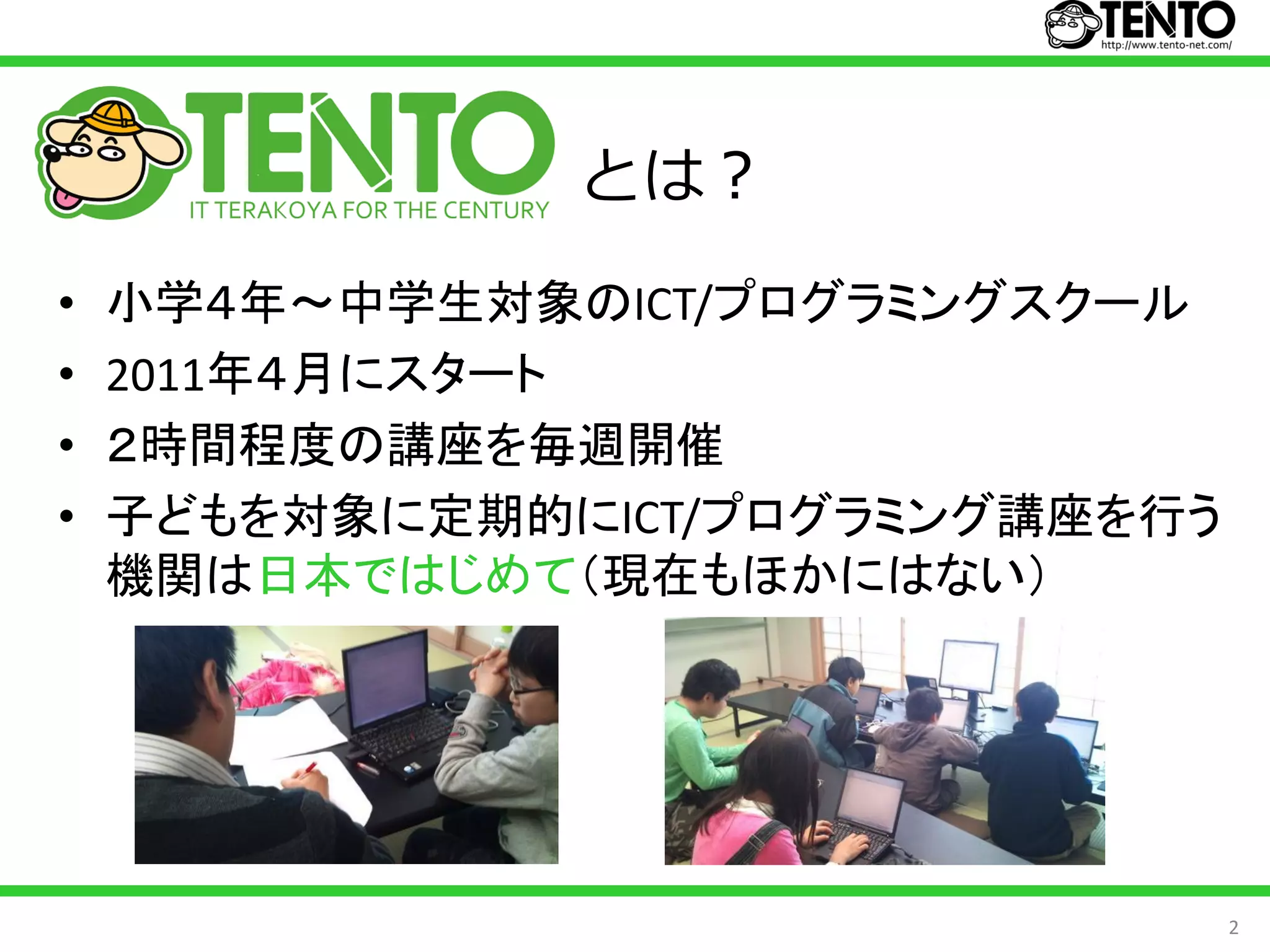 小学4年~中学生対象のICT/プログラミングスクール • 2011年4月にスタート • 2時間程度の講座を毎週開催 • 子どもを対象に定期的にICT/プログラミング講座を行う 機関は日本ではじめて(現在もほかにはない) 2