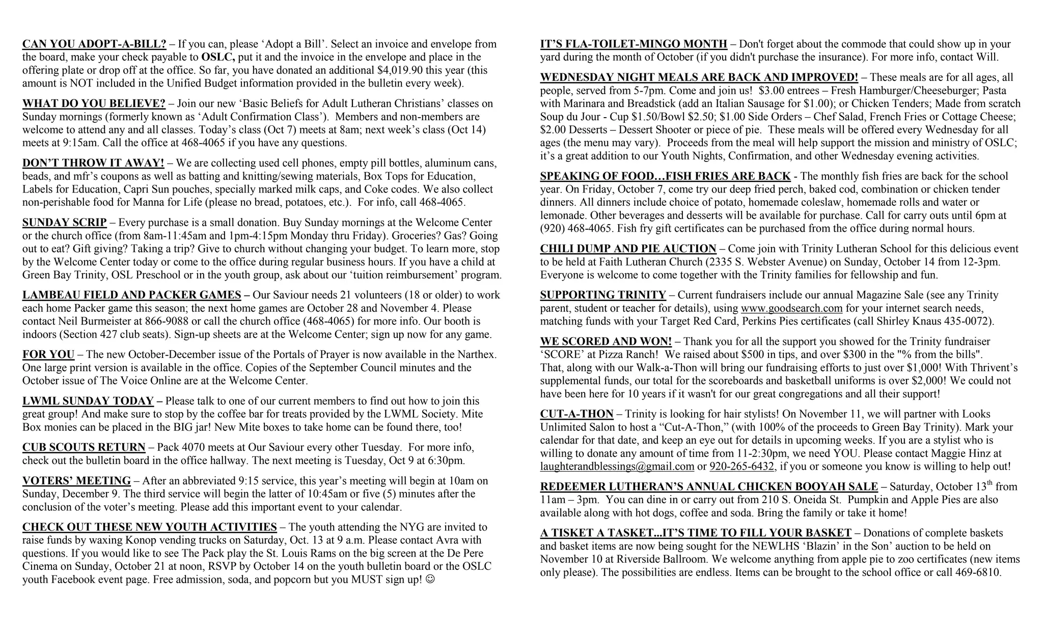 The document contains announcements for various church and school activities including adopting a bill to help pay invoices, adult education classes on basic beliefs, Wednesday night meals at the church, fish fries and chili dump fundraisers, volunteer opportunities including working at Packers games, and tours of Bethesda's original campus. It also includes notices about collecting donations for various causes, upcoming meetings, and youth activities like a movie outing and fundraising by waxing vehicles.
