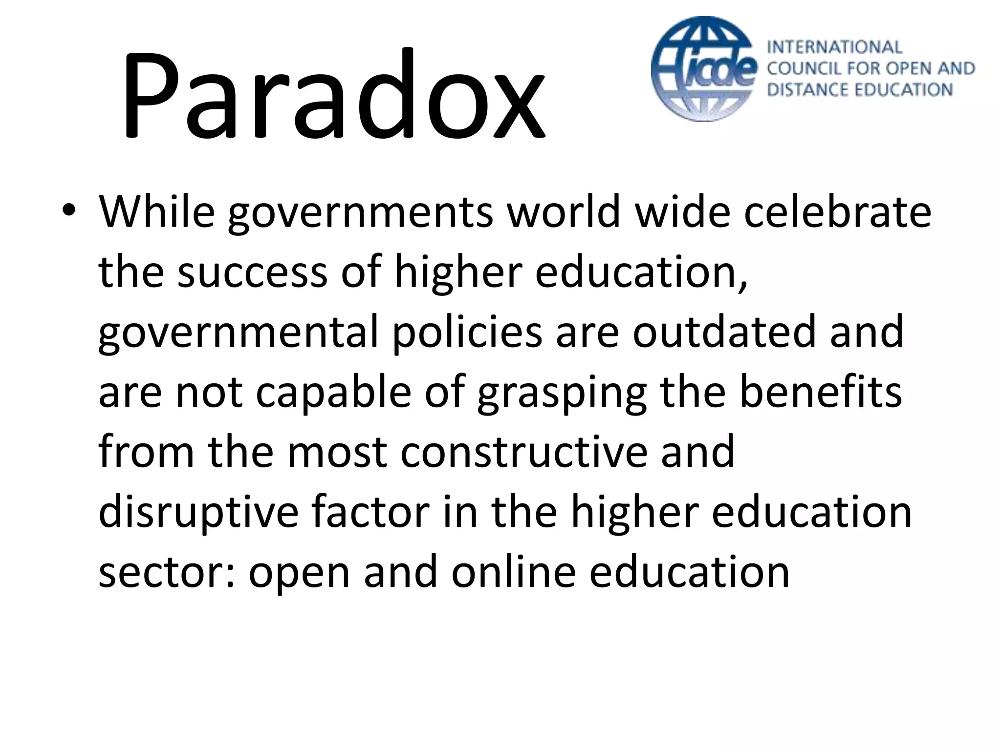The document discusses the transformative potential of open and online education within global higher education, highlighting its ability to improve individual employment prospects and societal benefits. It emphasizes the growing demand for accessible education, the increasing role of open universities, and the necessity for inclusive educational practices. The author calls for a collective, policy-driven dialogue on harnessing the opportunities of an evolving educational landscape.