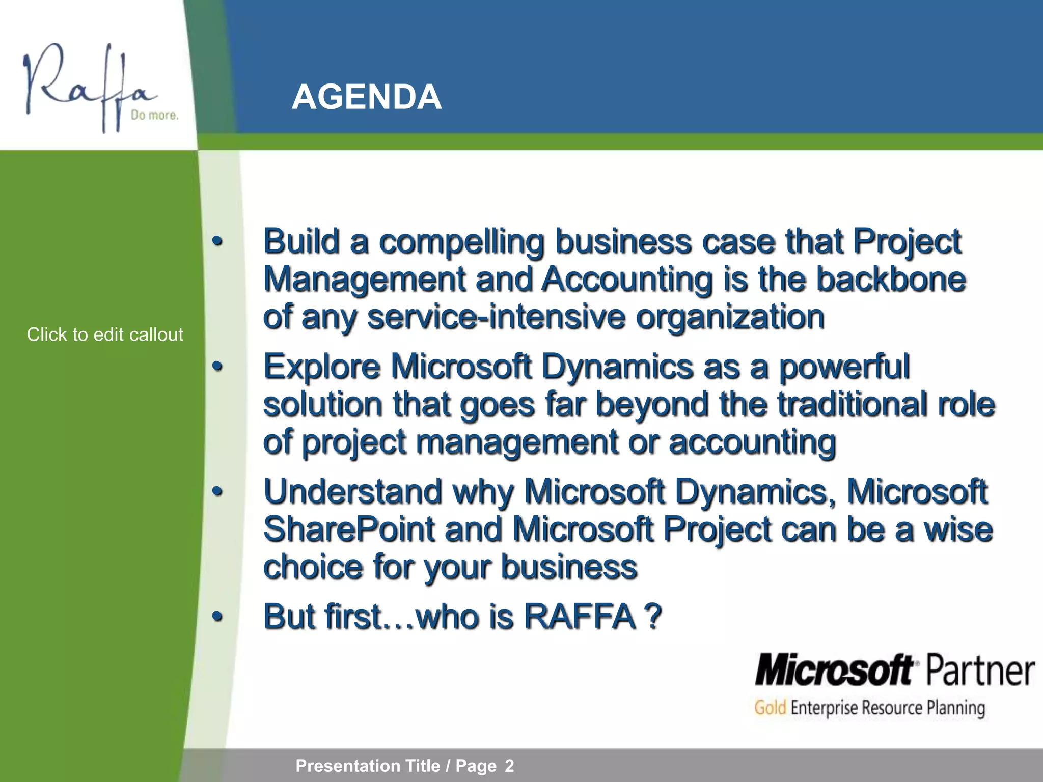 The document discusses solutions for project-driven organizations using Microsoft Dynamics as an integrated project management and accounting solution. It highlights key challenges organizations face around project delivery, reporting, and resource utilization. The solution aims to provide real-time visibility into projects, optimize resource allocation, shorten billing cycles, and improve profitability, efficiency, and customer service.