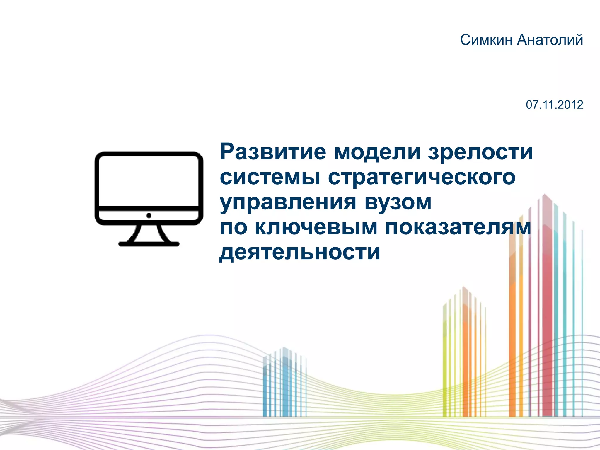 Документ посвящен развитию модели зрелости системы стратегического управления вузом по ключевым показателям. Он описывает создание информационно-аналитической системы для мониторинга деятельности вузов и необходимость системных изменений в управлении образованием. Также приведены проблемы мониторинга и предложены пути оптимизации процессов управления университетами.