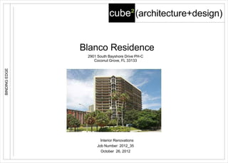 This document appears to be an architectural drawing sheet for interior renovations at an address in Coconut Grove, Florida. It includes drawing notes, symbols, abbreviations, and other annotations common to architectural plans. Key information includes the job number (2012_35), date (October 26, 2012), sheet number (20), and that it depicts partition and door notes, floor/wall materials, finishes, and fixture types/locations for the renovation project.