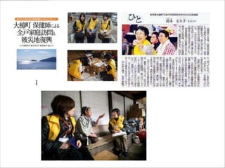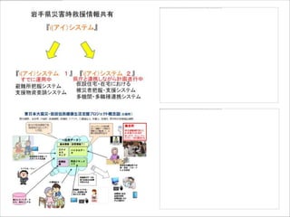 11月2日に多大な支援をいただいている日本マイクロソフトの社員研修でお話しするために、これまでの活動をまとめました。 まだまだ被災地の生活は復旧していません。 われわれは、被災者を支援している方々を支援するというコンセプトで活動してきました。一部をご紹介します。 テキストを入れようとしましたが、時間がかかりそうなので、先にこのままUPします。
