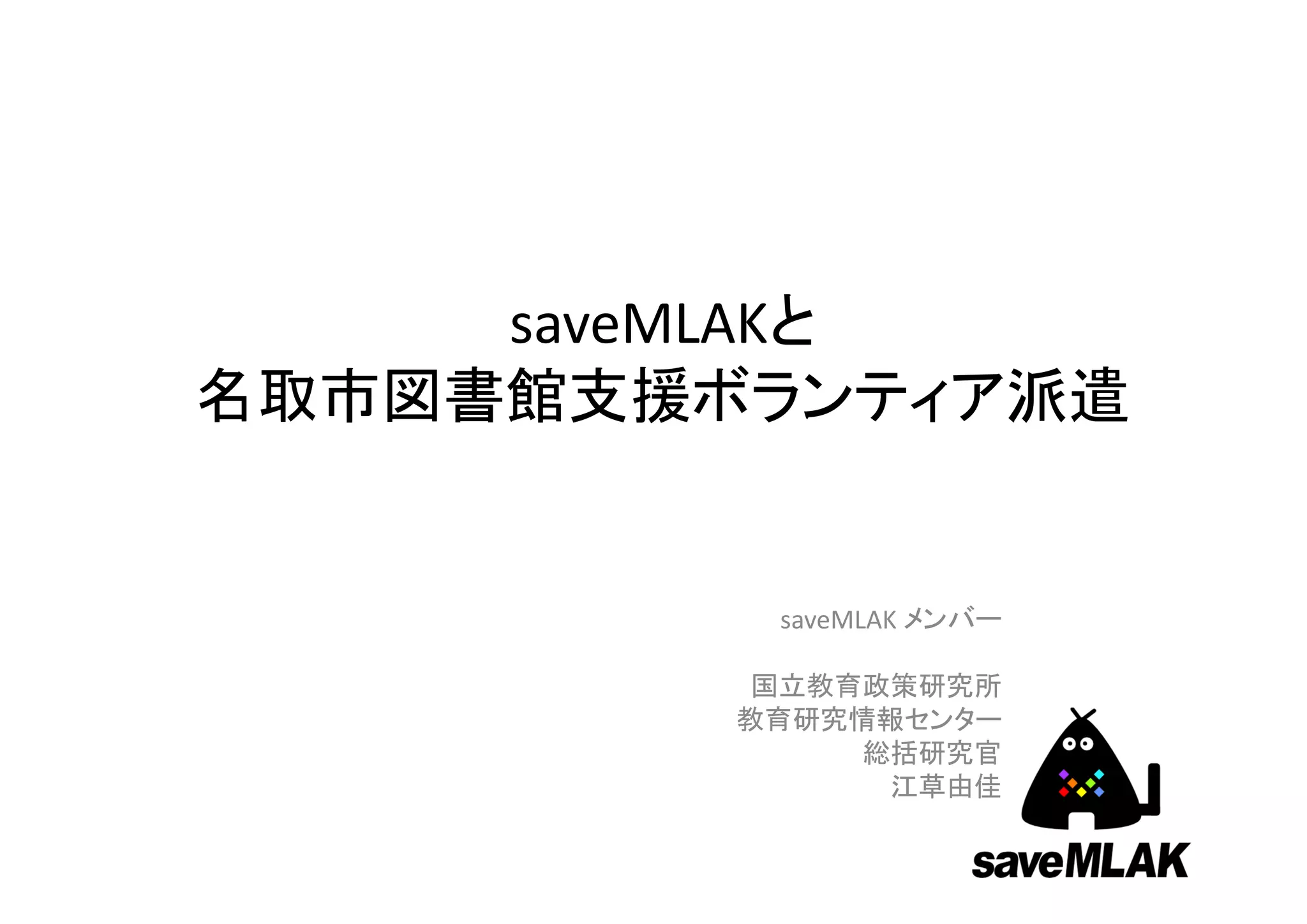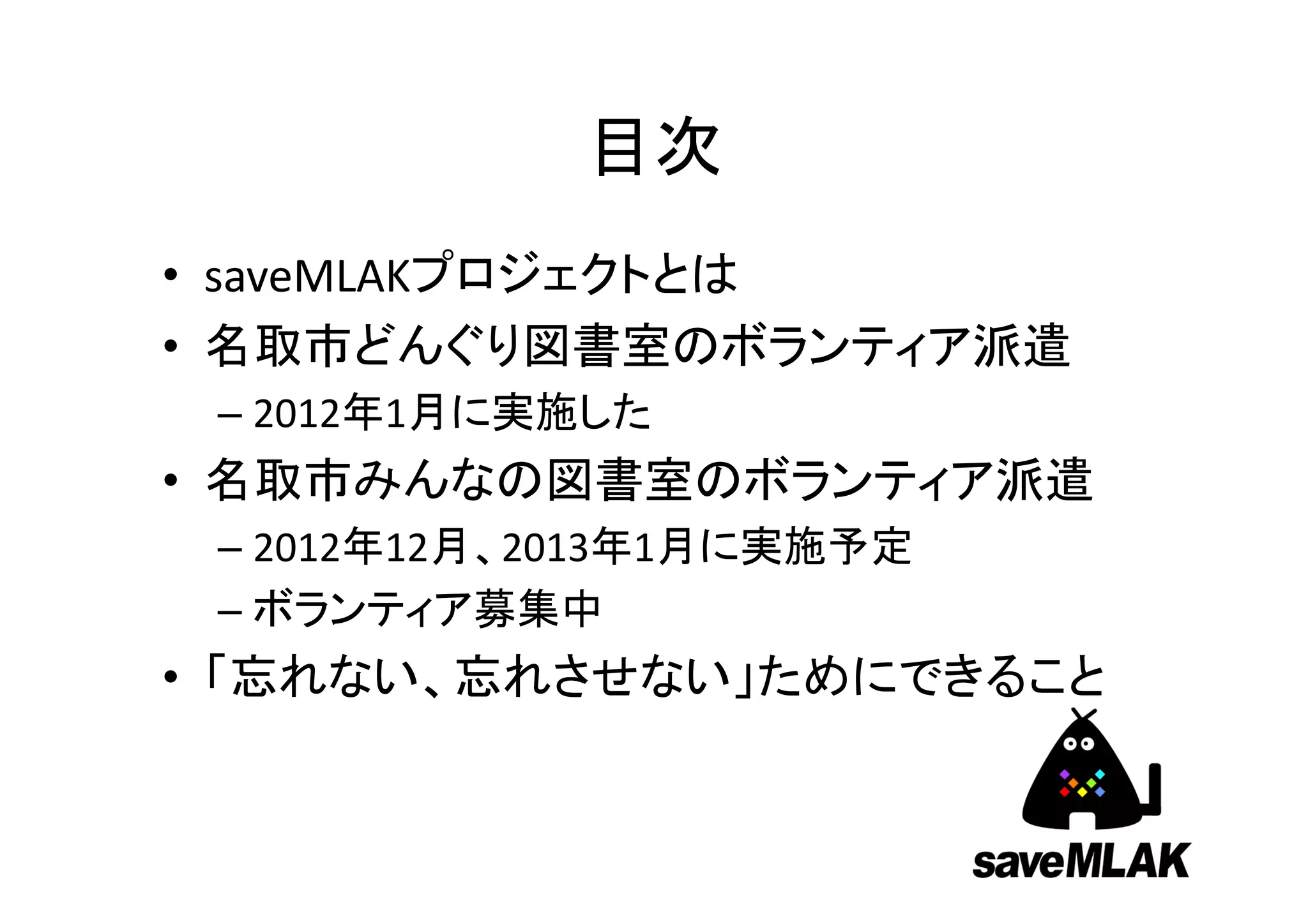 目次 • saveMLAKプロジェクトとは • 名取市どんぐり図書室のボランティア派遣