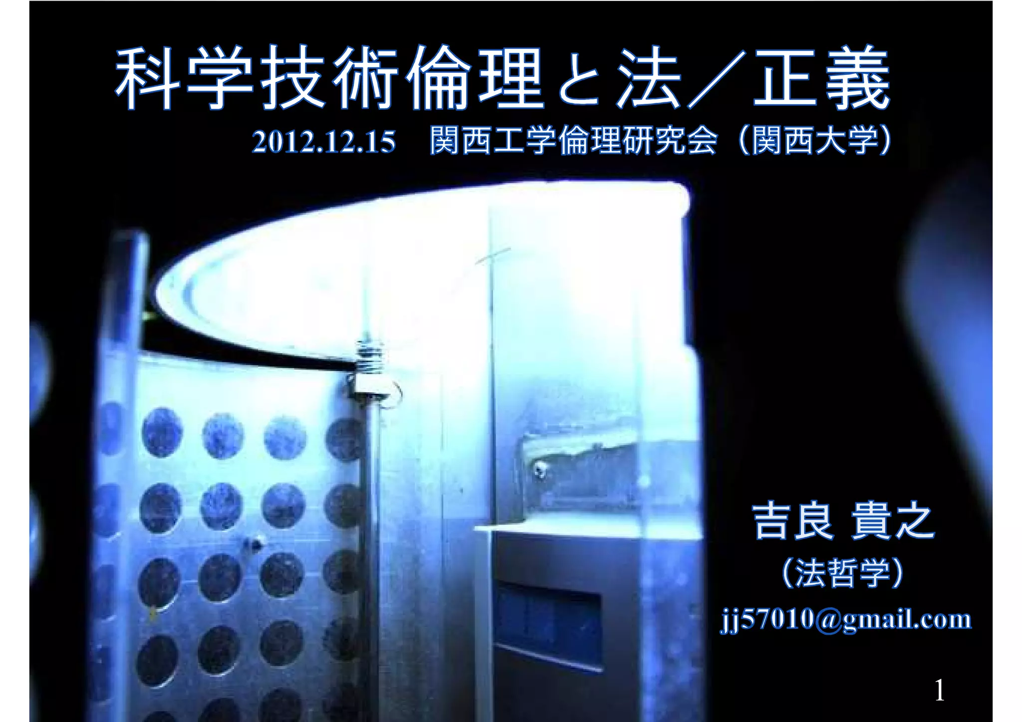 導入: 法哲学とはどういう学問か 2. イタリア・ラクイラ地震判決の「衝撃」 3. 世代間正義の問題設定 4. 原子力発電所事故と正義の時間的射程 5. 震災とプライバシー、そして「絆」 6. アーキテクチャ的支配と「自然」 こういった問題について、いろいろ考察します。 つねに 法/正義 との関連を念頭に置きます。 5