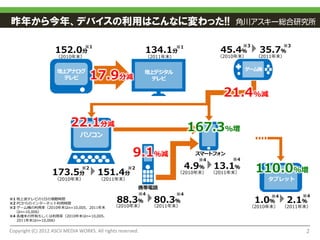 ※3 ※3 152.0分 134.1分※1 45.4% 35.7% ※1 (2010年末) (2011年末) (2010年末) (2011年末) ゲーム機 地上アナログ テレビ 17.9分減 地上デジタル テレビ 21.4%減 22.1分減 167.3%増 パソコン 9.1%減 スマートフォン ※4 ※4 173.5分 ※2 151.4分 ※2 4.9% 13.1% (2010年末) (2011年末) 110.0%増 (2010年末) (2011年末) タブレット 携帯電話 ※4 ※4 ※4 ※4 ※1 地上波テレビの1日の視聴時間 ※2 PCからのインターネット利用時間 88.3% 80.3% 1.0% 2.1% ※3 ゲーム機の利用率(2010年末はn=10,005、2011年末 (2010年末) (2011年末) (2010年末) (2011年末) はn=10,006) ※4 各端末の所有もしくは利用率(2010年末はn=10,005、 2011年末はn=10,006) Copyright (C) 2012 ASCII MEDIA WORKS. All rights reserved. 2