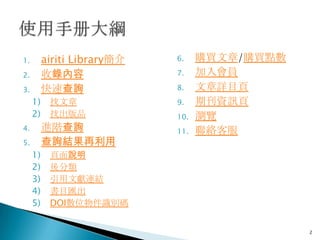airiti Library簡介 6. 購買文章/購買點數 2. 收錄內容 7. 加入會員 3. 快速查詢 8. 文章詳目頁 1) 找文章 9. 期刊資訊頁 2) 找出版品 10. 瀏覽 4. 進階查詢 11. 聯絡客服 5. 查詢結果再利用 1) 頁面說明 2) 後分類 3) 引用文獻連結 4) 書目匯出 5) DOI數位物件識別碼 2