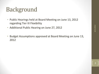 The document summarizes a school district's 2012-13 budget, which relies on $5 million in deficit spending. It notes reductions in property tax estimates and plans to sweep funds into reserves. Projected deficits are $11 million for 2013-14 and $10 million for 2014-15. The assistant superintendent recommends adopting the proposed annual budget and continuing efforts to reduce expenses, increase revenues, and communicate financial information to the community.