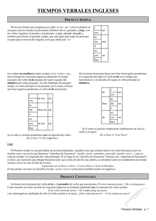 The document provides information on English verb tenses, including the present simple, present continuous, past simple, present perfect, and future tenses. It discusses how to form affirmative, negative, and interrogative sentences for regular and irregular verbs in each tense. It also explains the appropriate uses of each tense, such as using the present simple for habitual actions and the past simple to talk about completed past events.