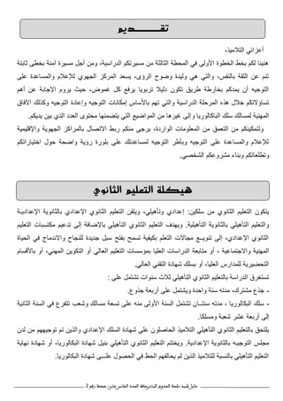 يتناول الدليل نظام الدراسة بالثانوي الإعدادي حيث يتطرق إلى نظام التقويم وكذا إمكانيات التوجيه وإعادة التوجيه و التكوين المهني