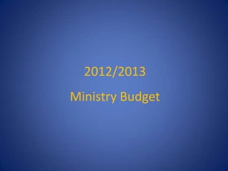 Alice Drive Baptist Church exists to help people come to know Jesus Christ. The church aims to achieve this through helping people know Jesus, know community, grow in character, and go share their faith. The document then provides details on the church's 2012/2013 ministry budget, including that ministry fund giving is up 15% and the current budget is $1.997 million with estimated giving of $2.1 million. It also lists the church's historical average per capita giving rates and projects giving for 2012/2013 based on attendance. The final section outlines the budget requests for various church ministries, which total $2,274,483 for the year.