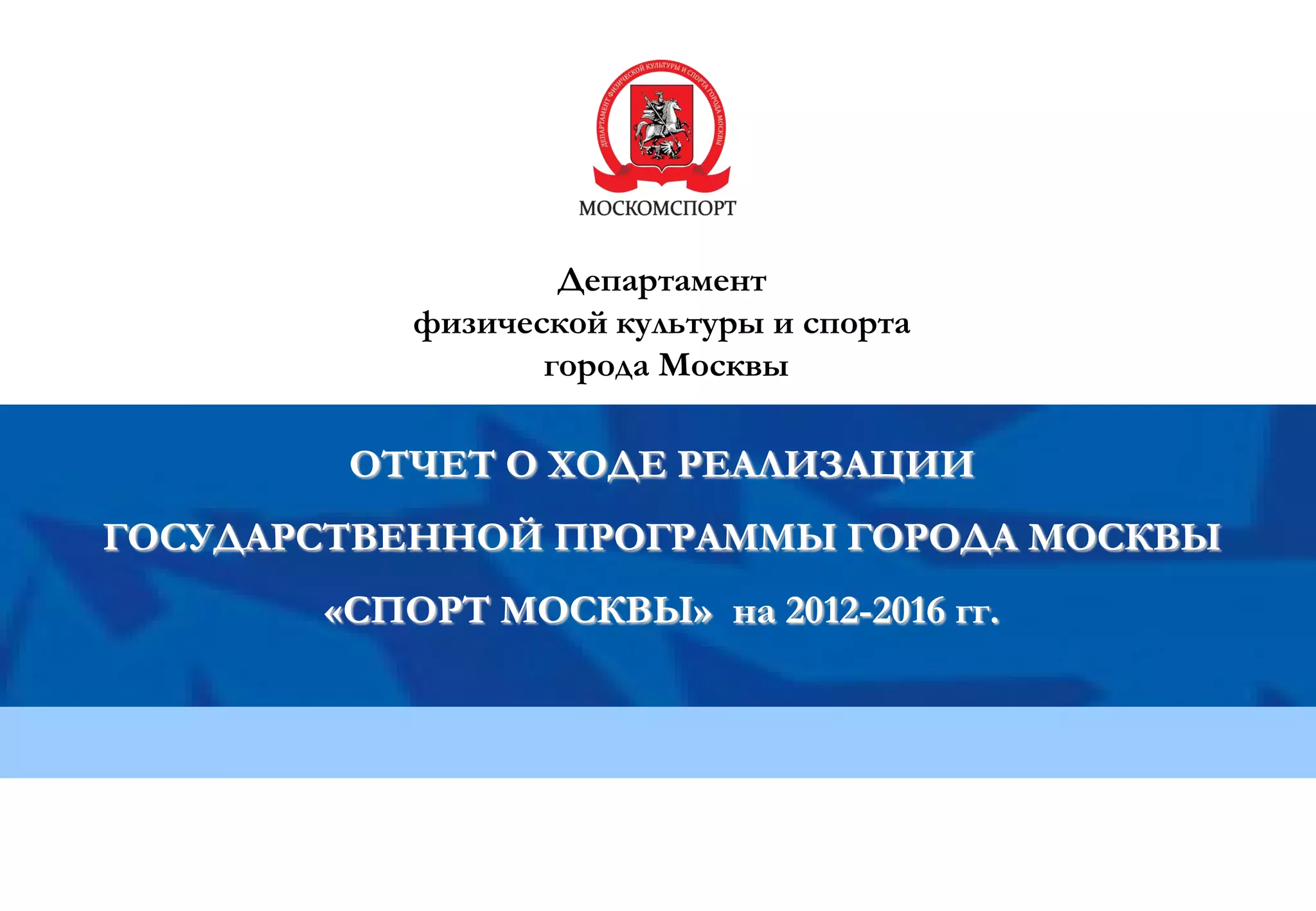 Отчет о реализации государственной программы «Спорт Москвы» на 2012-2016 годы охватывает задачи по массовой физкультурно-спортивной работе и подготовке спортивного резерва. Программа включает целевые показатели, такие как доля населения, занимающегося физической культурой, и обеспеченность спортивными сооружениями. Также акцентируется внимание на мероприятиях для лиц с ограниченными возможностями здоровья и строительстве новых спортивных объектов.