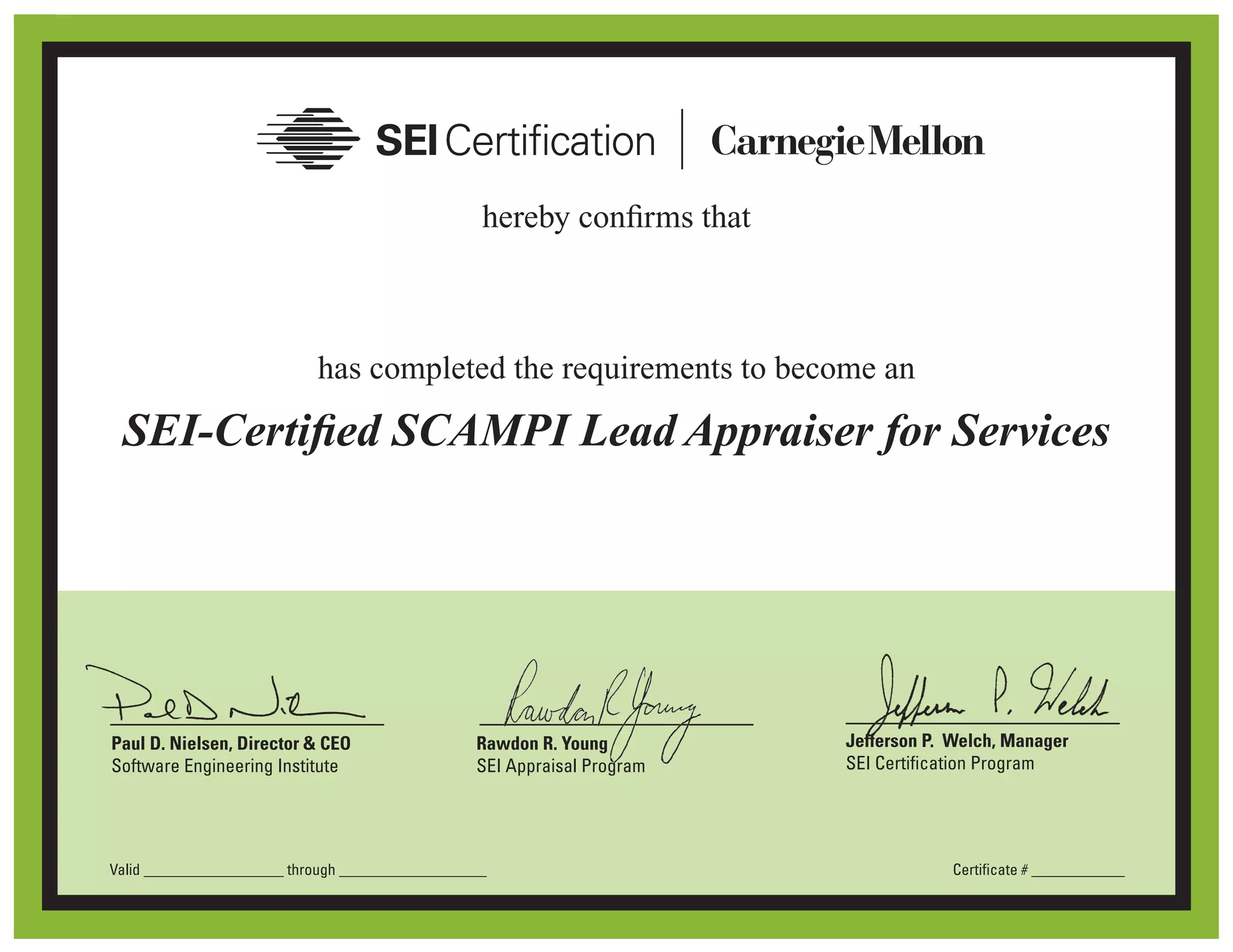 This document certifies that Raghavan Nandyal has completed the requirements to become an SEI-Certified SCAMPI Lead Appraiser for Services. The certificate is valid from October 29, 2012 through October 29, 2015, and confers all the rights, privileges, and honors of being an SEI-Certified SCAMPI Lead Appraiser for Services.