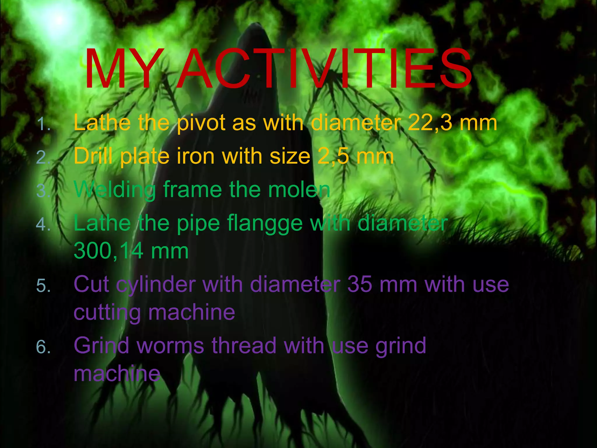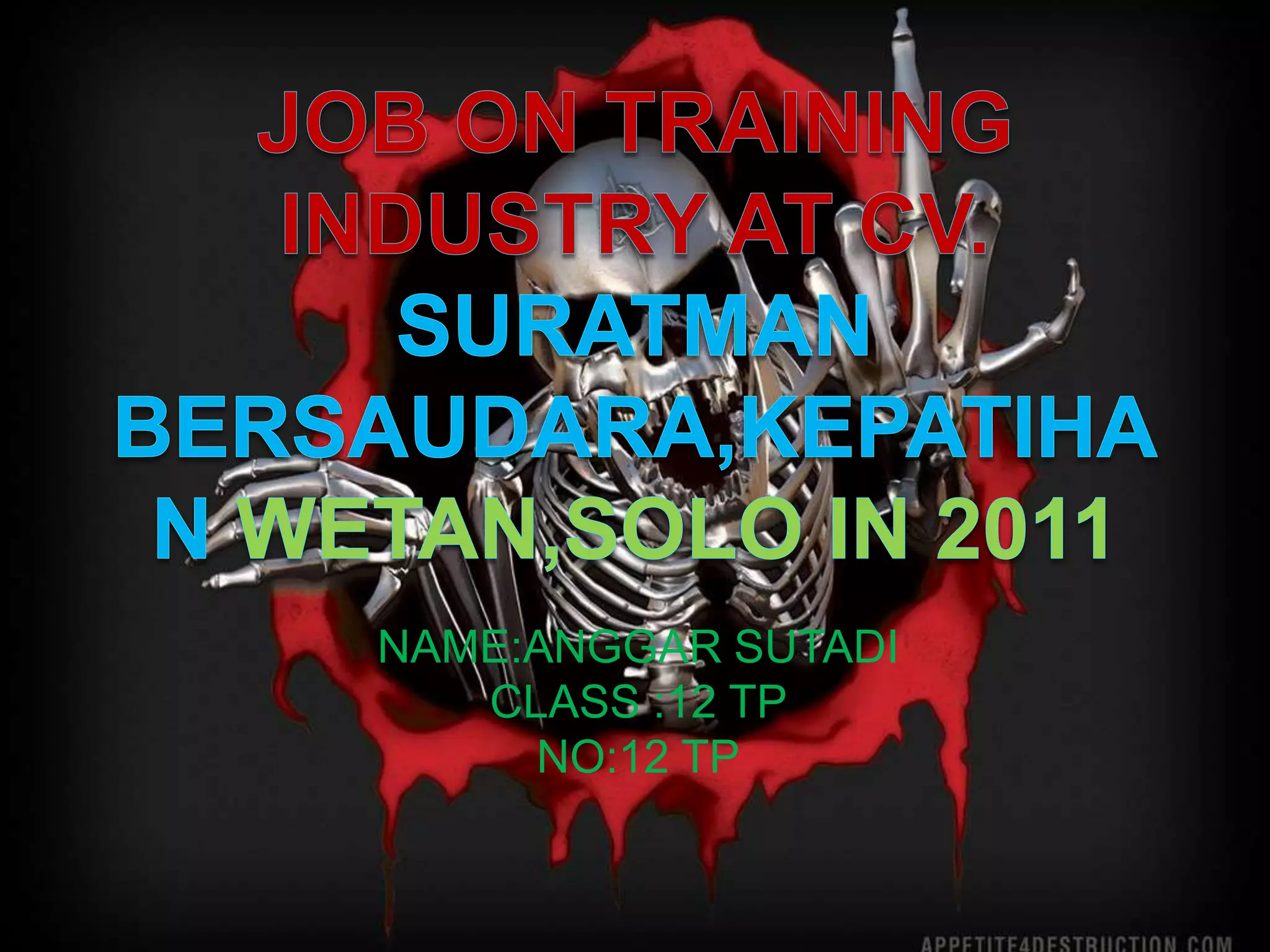 The document describes the activities of Anggar Sutadi, a student in class 12 TP. It lists 6 activities he engaged in including lathing a pivot to 22.3mm diameter, drilling plate iron with a 2.5mm drill, welding a molen frame, lathing a pipe flange to 300.14mm diameter, cutting a cylinder to 35mm diameter using a cutting machine, and grinding worm threads using a grinding machine. It provides details for each activity such as the number of people involved, duration, and whether the finished product met size specifications. In conclusion, Anggar gained many machine operating skills from his training at CV.SURATMAN BERSAUDARA,KEPATIHAN WET