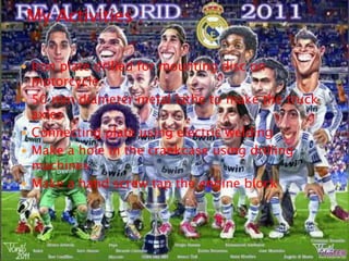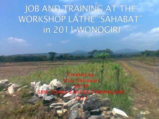 The document describes the process of making parts for a motorcycle undertaken by Diky Setiawan at SMK TUNAS BANGSA TAWANGSARI in 2012. This included drilling an iron plate for a disc mount, using a 50mm metal lathe to make truck axles, welding a connecting plate, drilling holes in a crankcase using drilling machines, and tapping threads in an engine block using a hand screw tap. It then provides details on the time taken, number of people involved, and notes on each task. The document concludes that the two month training provided valuable experience that couldn't be gained elsewhere.