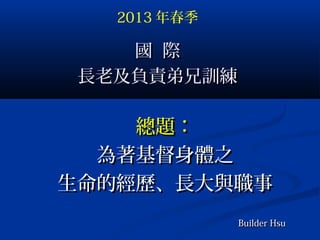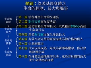 该文档围绕基督身体的生命经历、成长与职事展开,分为八篇内容,讨论生命的经历、长大、职事与身体的关系。重点在于通过与神和人之间的交通,对付天然人,以实现生命的成长和建造。最终目标是成为一个合格的神的仆人,并为新耶路撒冷的实现做好准备。