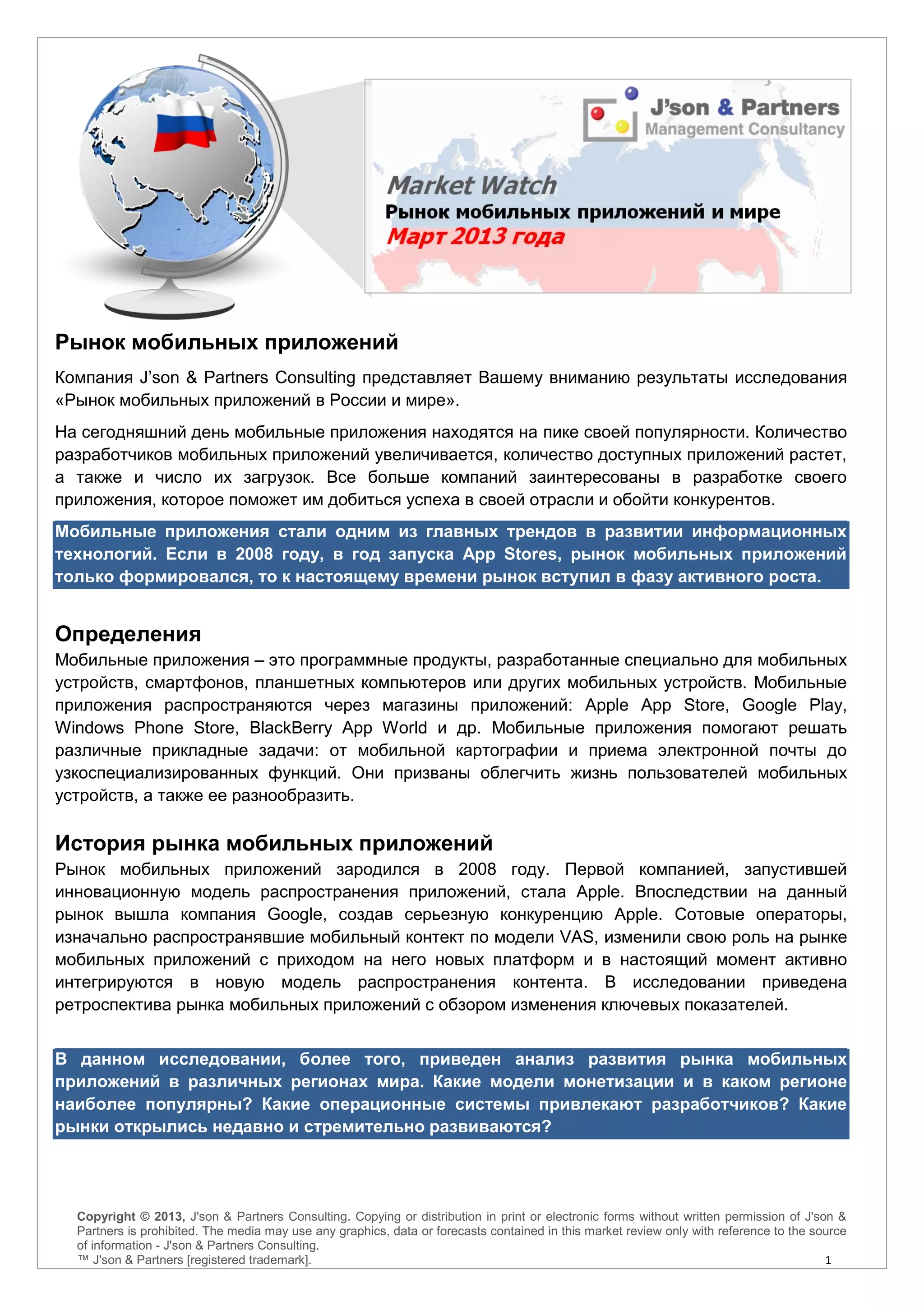 Документ представляет результаты исследования рынка мобильных приложений в России и мире, подчеркивая их рост и популярность с 2008 года. Описаны ключевые сегменты рынка, такие как контентные приложения, бизнес-приложения и мобильные игры, а также бизнес-модели монетизации. Прогнозируется, что к 2016 году мировой рынок мобильных приложений вырастет до $65,79 млрд, а российский рынок достигнет $1300 млн.