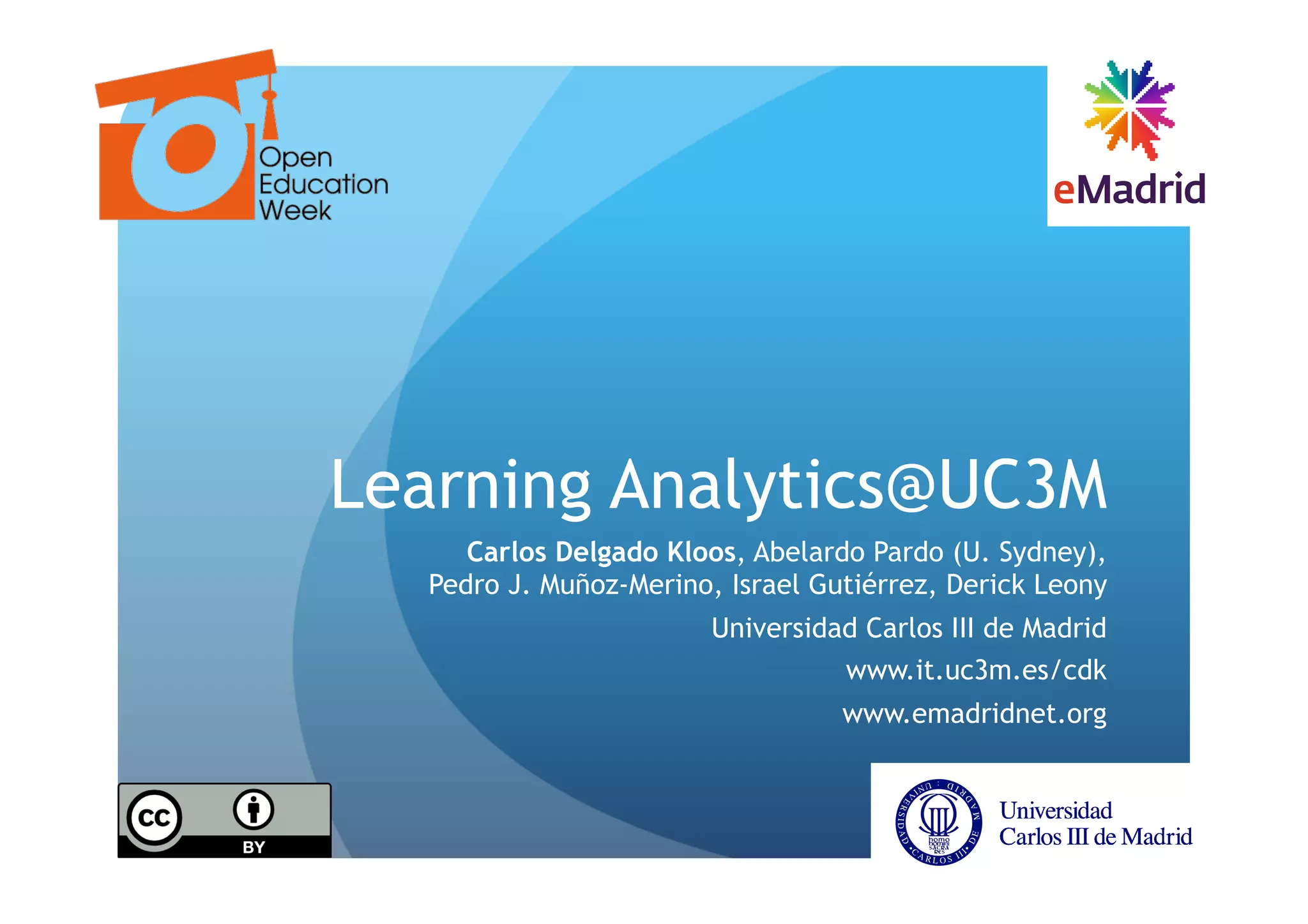 The document discusses learning analytics research at UC3M. It describes 5 developments: 1) The CCOLAB system captures raw learning events in a virtual environment. 2) The LearnGlass platform facilitates creating visualizations of captured data. 3) The Genghis project analyzes online student behavior data from the Khan Academy platform. 4) The ClassON system uses analytics to provide just-in-time feedback to teachers and students in classrooms. 5) The ISCARE system applies analytics and gamification to motivate students through competitive exercises.