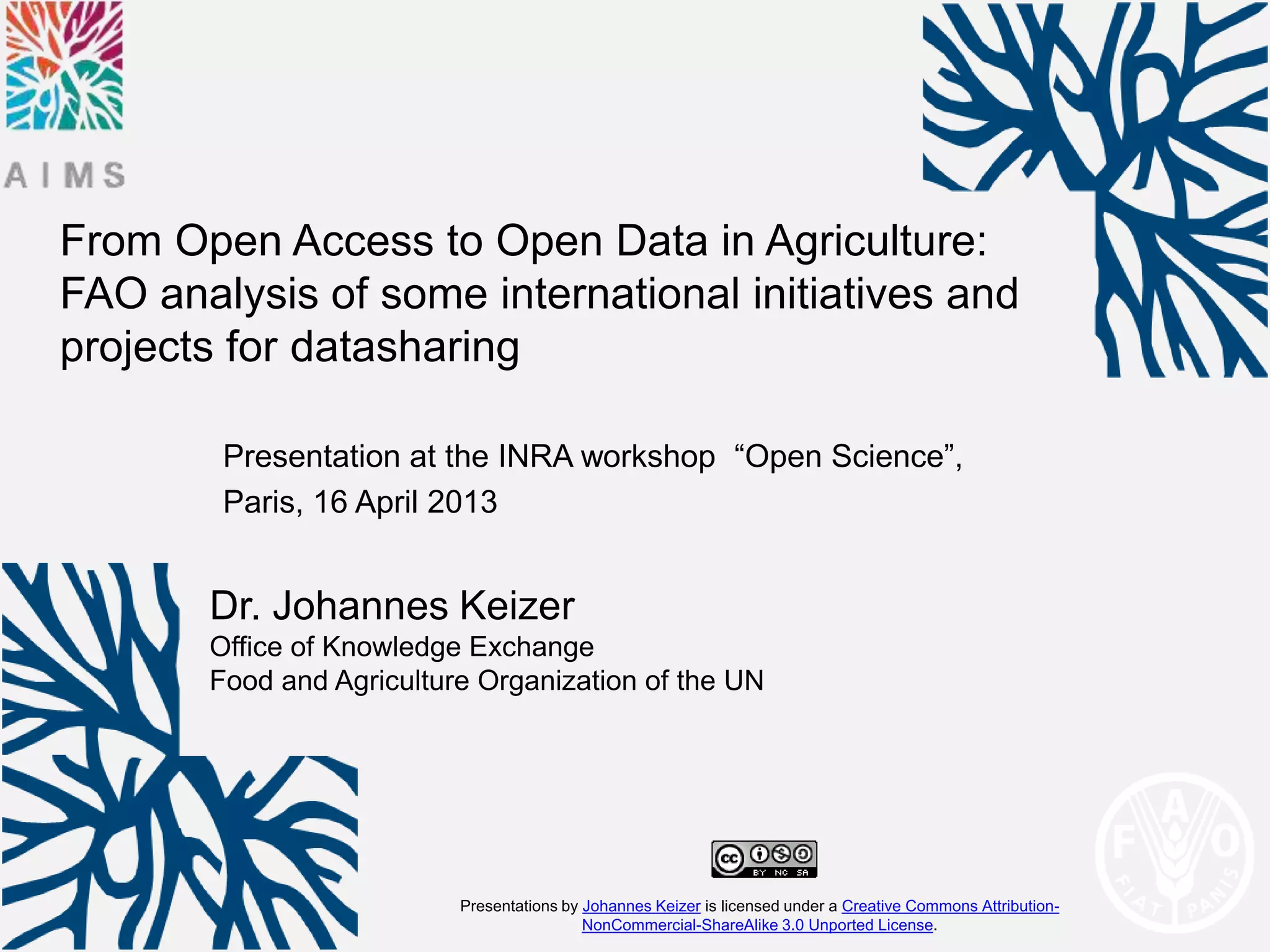 This document summarizes Johannes Keizer's presentation on open access and open data in agriculture. It discusses the increasing amount of scientific data being generated and challenges around data sharing. It presents initiatives like CIARD and AIMS that aim to make agricultural research data publicly accessible. It also discusses the Research Data Alliance and efforts to establish data sharing policies and standards to encourage researchers to share data in their domains.