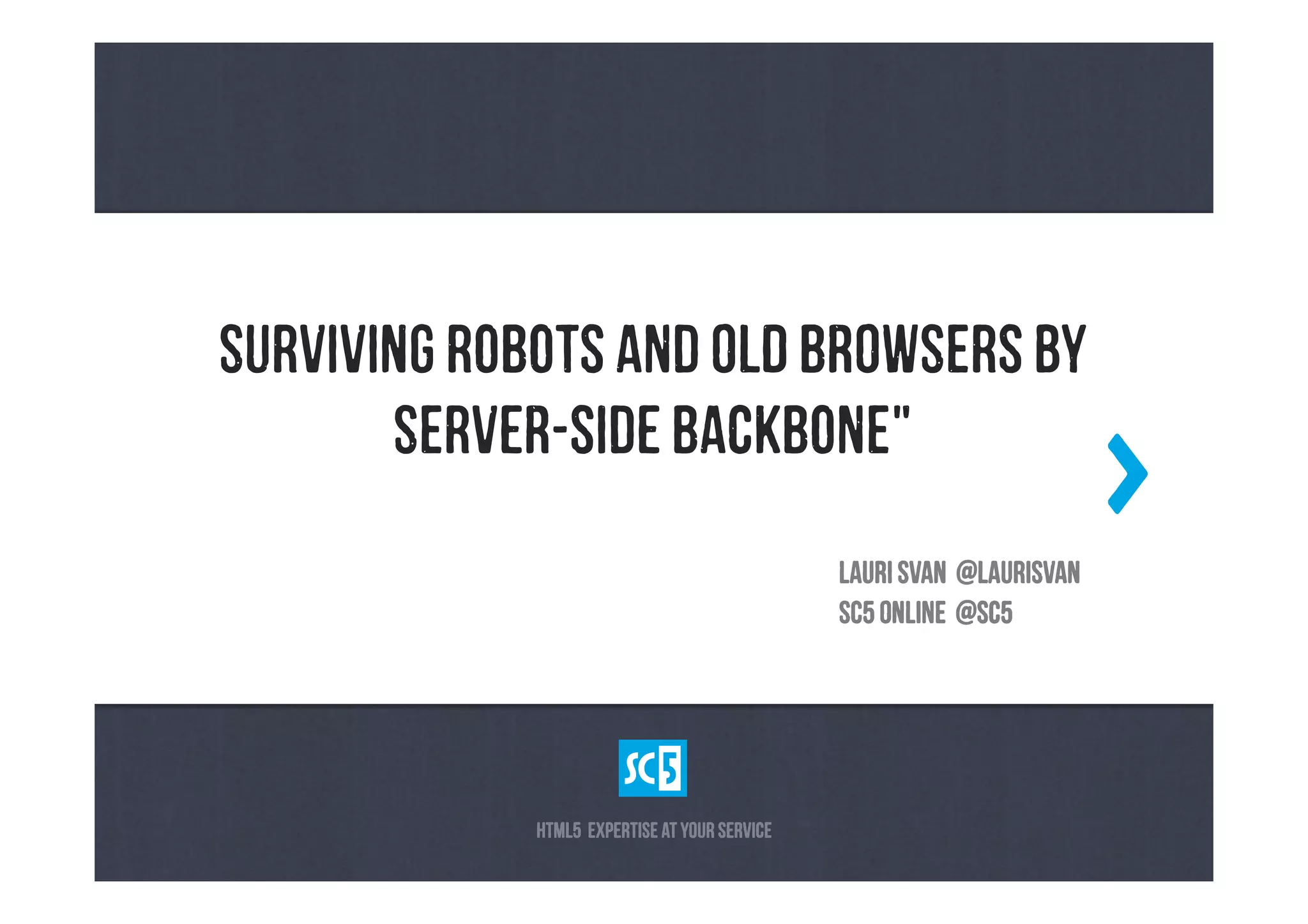 This document discusses using a proxy server to render single page applications for search engines and legacy browsers. It introduces the concept of a server-side backbone that runs the same backbone application code on both the client and server. This allows rendering the initial HTML on the server to avoid problems with robots and speeds up loading for users. It also discusses some of the challenges in implementing this approach like emulating the DOM and browser APIs on the server. Overall it presents server-side rendering as a way to solve crawlability and legacy browser support problems for single page apps.