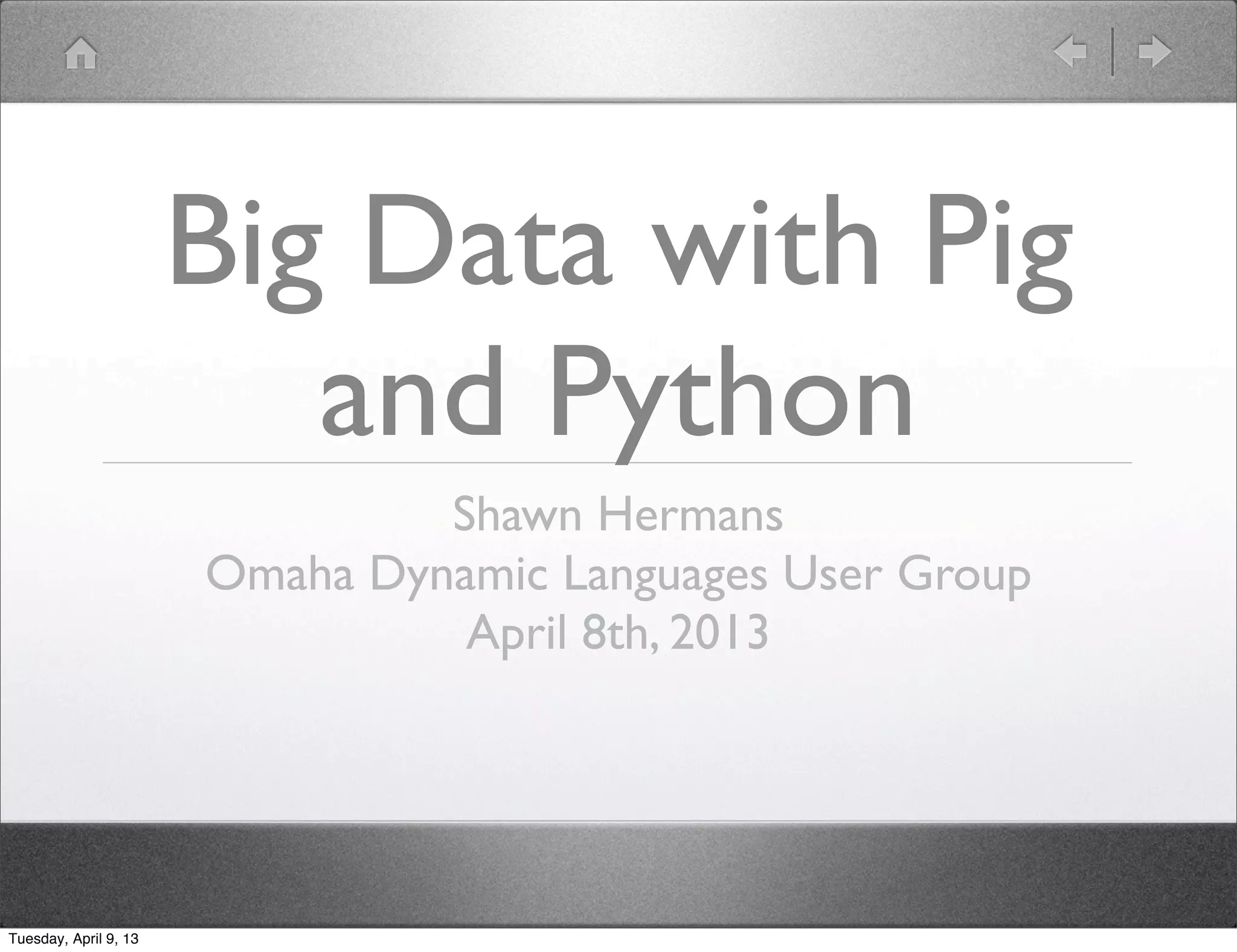 Shawn Hermans gave a presentation on using Pig and Python for big data analysis. He began with an introduction and background about himself. The presentation covered what big data is, challenges in working with large datasets, and how tools like MapReduce, Pig and Python can help address these challenges. As examples, he demonstrated using Pig to analyze US Census data and propagate satellite positions from Two Line Element sets. He also showed how to extend Pig with Python user defined functions.