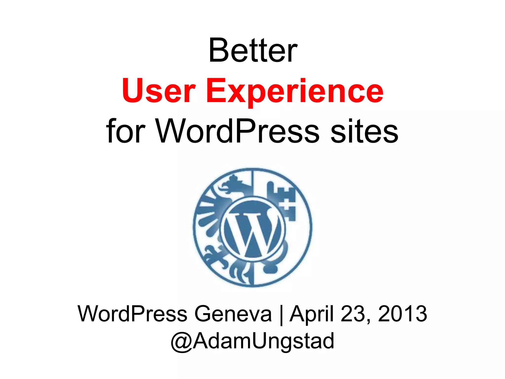 This document discusses improving user experience for WordPress sites. It defines user experience and outlines several methods for evaluating and improving UX, such as card sorting, personas and usability testing. The document then provides tips for good design practices like using tables and contrast to improve readability, implementing responsive and mobile-first design, and using stock images and fonts to enhance a site's visual design without reinventing elements. It stresses the importance of content, calls to action, and metadata like excerpts and contact details to create a high-quality user experience.