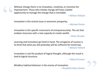 Creating Environments for Innovation to Flourish discusses key principles for fostering innovation. It outlines a 5 step guide: [1] become a learning organization by solving problems; [2] retain intrinsically motivated employees through slack and bottom-up ownership; [3] implement community architecture using open source principles; [4] have a clear executive vision through techniques like vision sessions; and [5] use user stories to articulate requirements. The document emphasizes that innovation emerges from diverse, self-organizing teams when given autonomy, motivation, and opportunities to learn and improve.