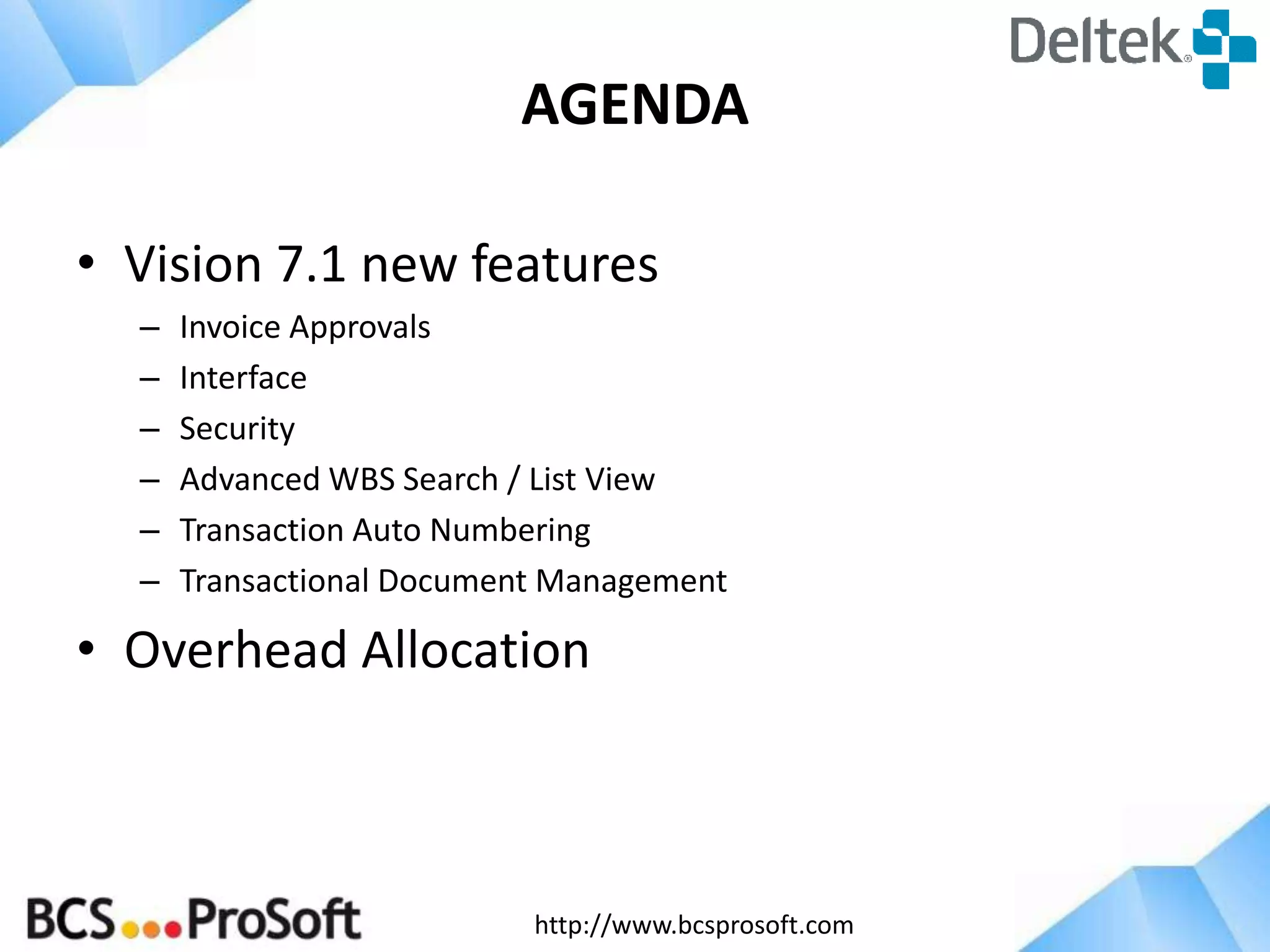 The Deltek Vision User Group Meeting held in September 2013 introduced new features including invoice approvals, advanced search capabilities, and transaction auto numbering. It detailed an enhanced invoice approval process designed to streamline billing, provide alerts, and allow for delegation when needed. Additionally, the meeting covered overhead allocation practices and methods to capture project costs accurately.