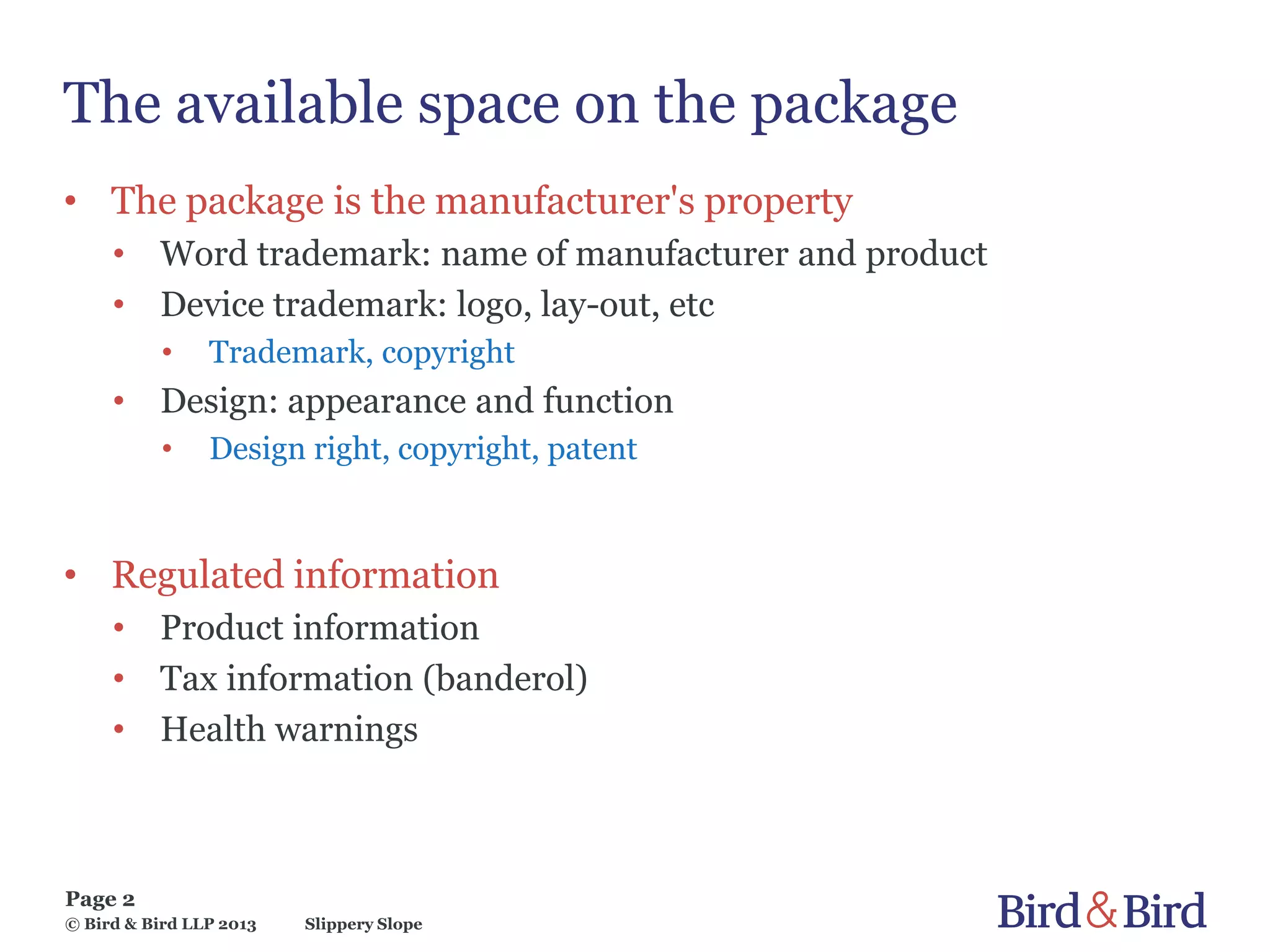 The document discusses regulations for packaging and labeling of tobacco products in the European Union. It proposes that tobacco product packaging have health warnings covering 75% of the front and back surfaces, with additional warnings on the sides. This raises intellectual property issues as it significantly reduces the space available for trademarks and branding. The document analyzes how these regulations may infringe upon trademark rights and property rights under EU and international laws. It examines relevant case law and argues the regulations do not adequately balance free movement of goods with intellectual property protection.