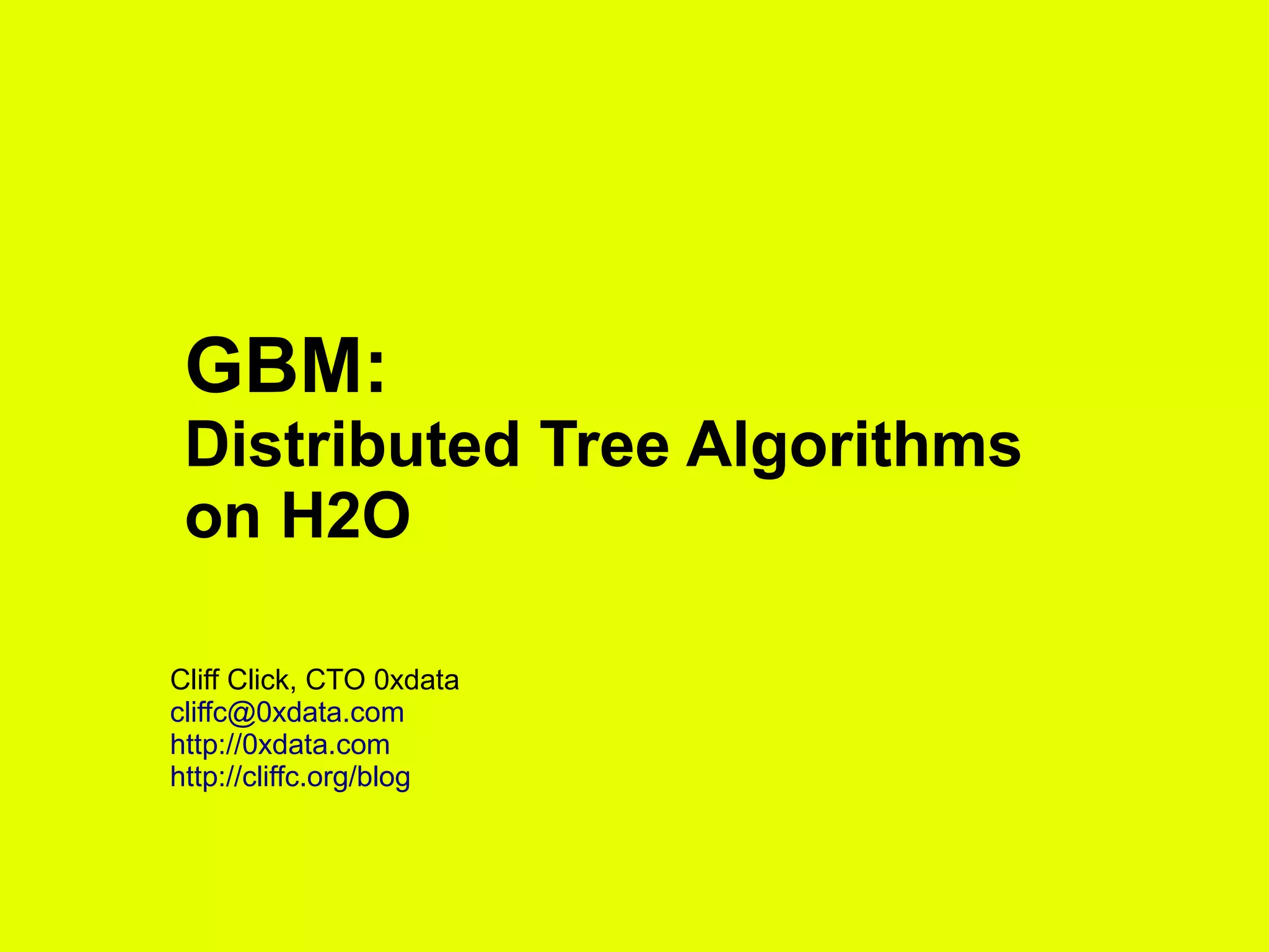 The document discusses H2O, a pure Java open-source platform for distributed data analytics that supports various algorithms including generalized linear models and gradient boosting machines. It details the architecture of distributed vectors and frames, highlights tree-based algorithm execution, and showcases parallel execution patterns for efficient data handling. Additionally, it explains coding taxonomies and provides examples of data processing tasks using map/reduce methods in a distributed computing environment.