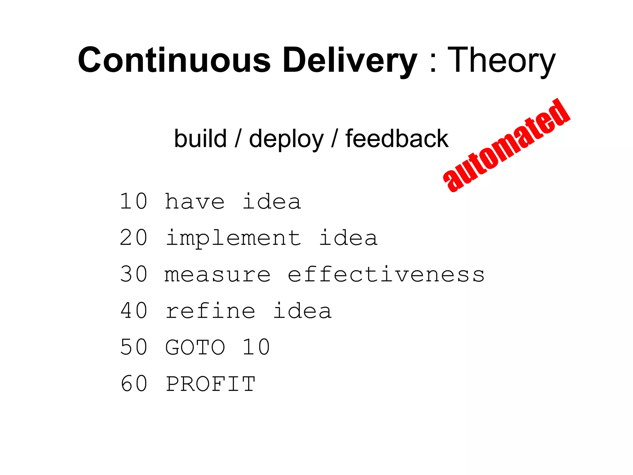 The document provides an overview of the theory, reality, and practical steps involved in implementing continuous delivery for an existing codebase and systems. It discusses improving the build process to make it reproducible and automated. It also covers deploying code in a zero-downtime manner, monitoring applications, and setting up development, staging, and production environments using tools like Chef and Jenkins for automation and reproducibility. The goal is to iteratively refine processes to make them more continuous and reduce issues during code deployment.