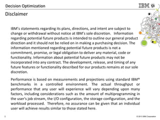 The document discusses enhancements in decision optimization techniques for mixed-integer programming (MIP) solvers, specifically focusing on exploiting performance variability through concurrent root cut loops in CPLEX. It details both external and internal implementations, highlighting potential benefits and performance improvements achievable by varying initial conditions and parameter settings. The findings reveal that running multiple configurations can yield diverse solutions, potentially leading to better optimization outcomes.
