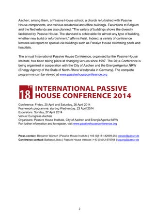 The 2014 International Passive House Conference will be held from April 23-27 in Aachen, Germany. Experts from around the world will present practical examples and the latest solutions for energy efficient construction through more than 100 lectures and an accompanying trade fair. Topics will include challenges in different climates, energy retrofits, and pilot projects for special buildings like schools, churches, homes, and offices. The Passive House standard can save up to 90% of the energy used for heating and cooling buildings. Attendees will have the opportunity to participate in courses and workshops or go on excursions to completed Passive House projects in the surrounding area.