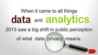 The document outlines 13 significant highlights in data analytics from 2013 that shaped public perception, including advances in data privacy, the convergence of CTO and CMO roles, and the rise of data-driven marketing decisions. Major highlights featured companies leveraging analytics, such as Spotify and Twitter, increases in data partnerships, and the introduction of new analytics technologies. It emphasizes the transformation within businesses due to big data and anticipates a complex future for data privacy and user experience in 2014.