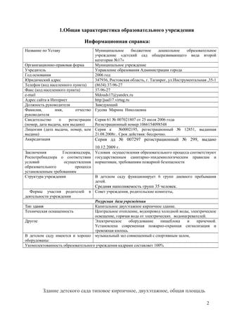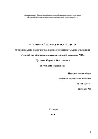 Публичный доклад заведующего детского сада №17 за 2013-2014 учебный год включает общую характеристику учреждения, его организационно-правовую форму, лицензирование, аккредитацию и структуру групп. В детском саду функционирует 6 groepen, с общим числом 210 воспитанников, и описывается работа педагогического коллектива, включая формы самоуправления. Образовательная программа учреждения ориентирована на всестороннее развитие детей и соблюдение норм санитарно-эпидемиологического контроля.