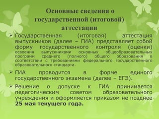 Документ содержит информацию о проведении государственной (итоговой) аттестации выпускников в форме единого государственного экзамена (ЕГЭ) в 2013 году, включая обязательные и выборные предметы, сроки и условия сдачи экзаменов. Обсуждаются детали, такие как минимальные баллы для получения аттестата, процедуры апелляции и контрольно-измерительные материалы, используемые на экзаменах. Также предоставлены ресурсы для информационной поддержки выпускников и их родителей.