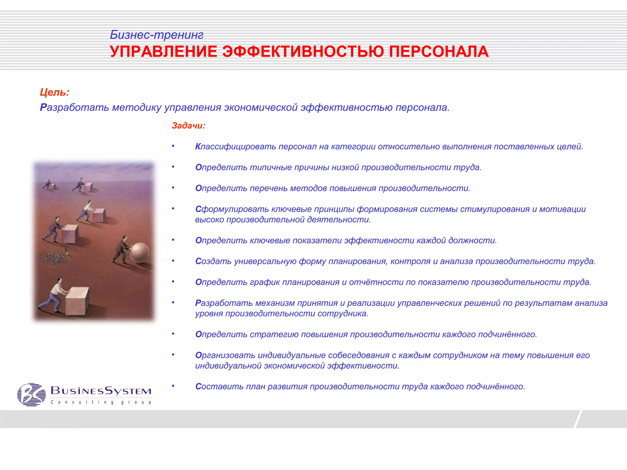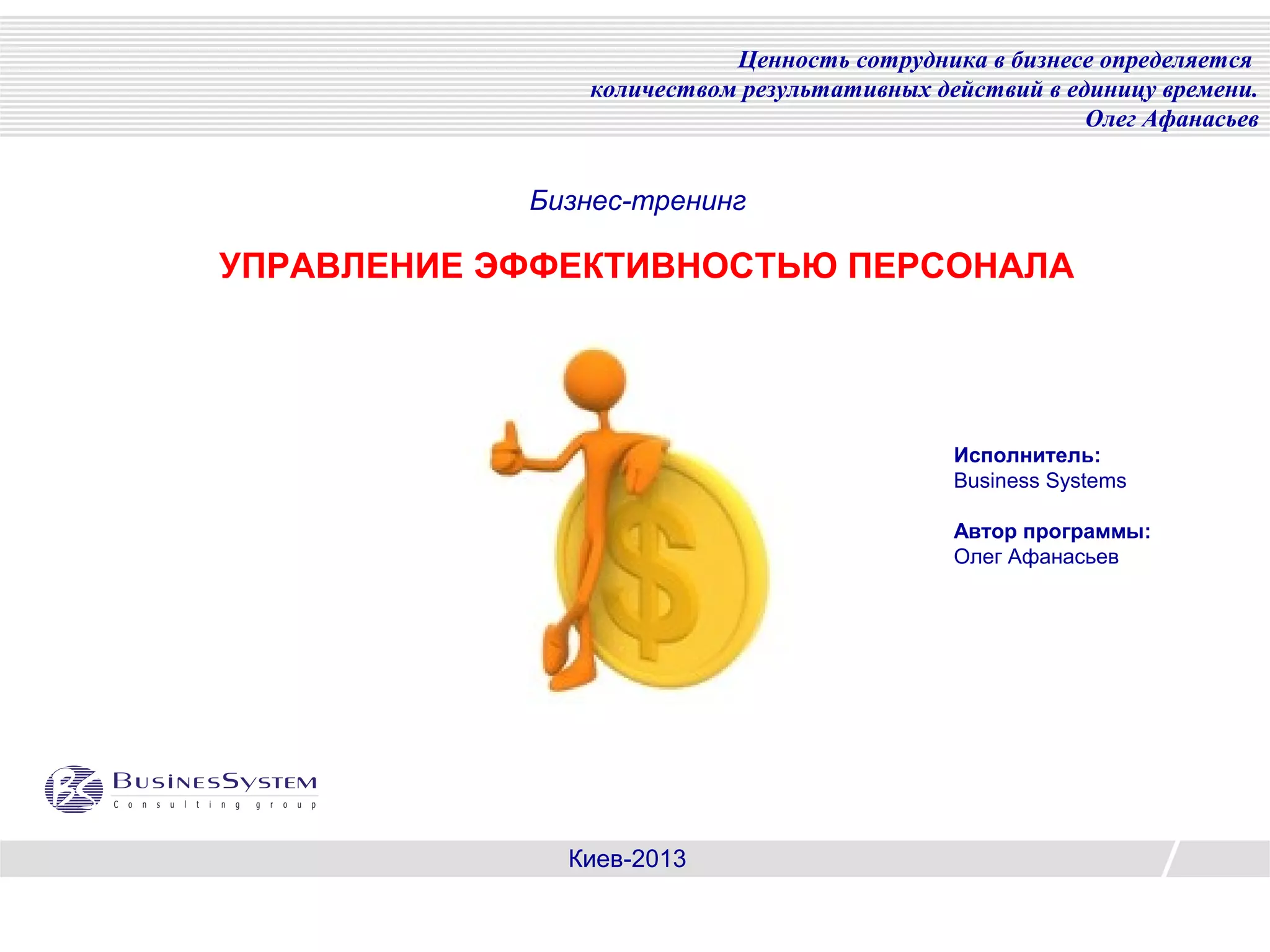 Документ описывает программу бизнес-тренинга по управлению эффективностью персонала, разработанную Олегом Афанасьевым. Основные цели тренинга включают создание методики управления экономической эффективностью сотрудников, определение причин низкой производительности и формулирование ключевых принципов мотивации. Программа состоит из трех дней занятий, включая практические упражнения и индивидуальные беседы с сотрудниками для повышения их производительности.