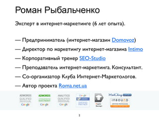 Веб-аналитика 2013 года рассматривает новшества в сфере интернет-маркетинга, включая универсальную аналитику и модели атрибуции. Роман Рыбальченко, эксперт с опытом, обсуждает влияние многоэкранного взаимодействия и важность ремаркетинга и персонализации. Документ выделяет актуальные инструменты и технику, такие как Google Tag Manager и отслеживание звонков для повышения эффективности интернет-продаж.