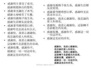 文档表达了对生活、友情和爱的感激之情,强调了母亲、自然和时间的重要性。它还探讨了在秋天与春天之间的情感对比,以及通过开放式提问和反思的方式,深入理解个人经历的价值。最后,文档以对学习和生活的美好祝愿结束。