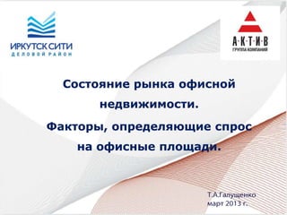 Документ анализирует динамику прироста офисных площадей в городе с 2007 по 2012 год, с акцентом на введенные квадратные метры и прогнозы на 2013 год. Рассматривается распределение офисных площадей по районам и классам, а также изменения цен на рынке офисной недвижимости. В документе также представлена информация о совокупной доходности офисной недвижимости за указанный период.