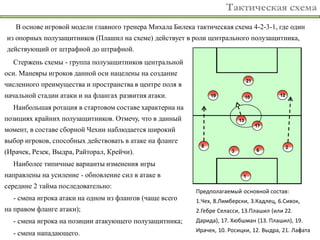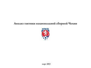 Документ представляет анализ тактики национальной сборной Чехии по футболу, в частности её игровую модель под руководством главного тренера Михала Билека, основанную на схеме 4-2-3-1. Описаны ключевые аспекты как атакующей, так и оборонительной стратегии команды, включая маневры центральных полузащитников и их роль в создании численного преимущества. Указаны сложности, с которыми сталкивается сборная при завершении атак, особенно в области передачи мяча на ударные позиции.