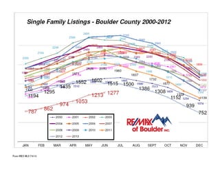 This document presents real estate market statistics for the first half of 2013 in Boulder County and surrounding areas. It includes data on the number of sold single-family and attached dwellings, as well as median and average sales prices by area for various years from 2008 to 2013. Notable trends include an increase in sales prices and properties sold over the years, highlighting a recovering and active real estate market.