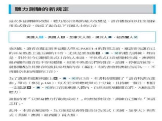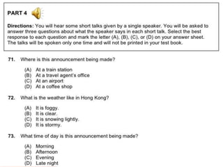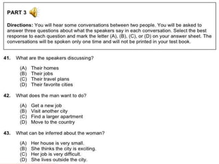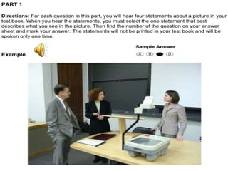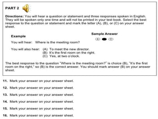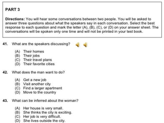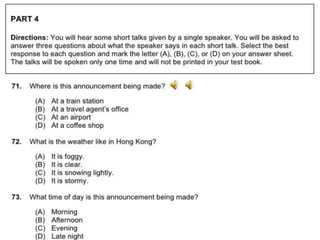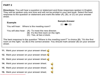 聽力 總共有一百題,共有四大題。 聽力的考試時間大約為四十五分鐘。 第一大題:照片描述 十題 (四選一) 第二大題:應答問題