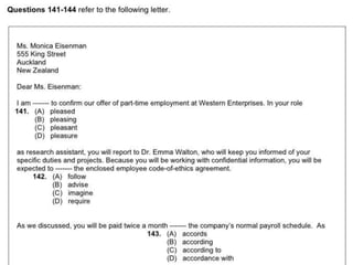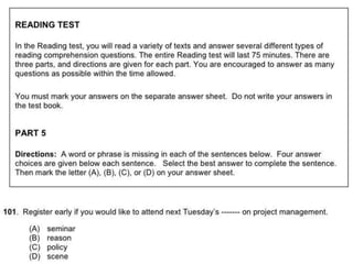 閱讀 總共有一百題,題目及選項都印在題本上。 考試時間為七十五分鐘。 第五大題:單句填空 四十題 (四選一) 第六大題:短文填空