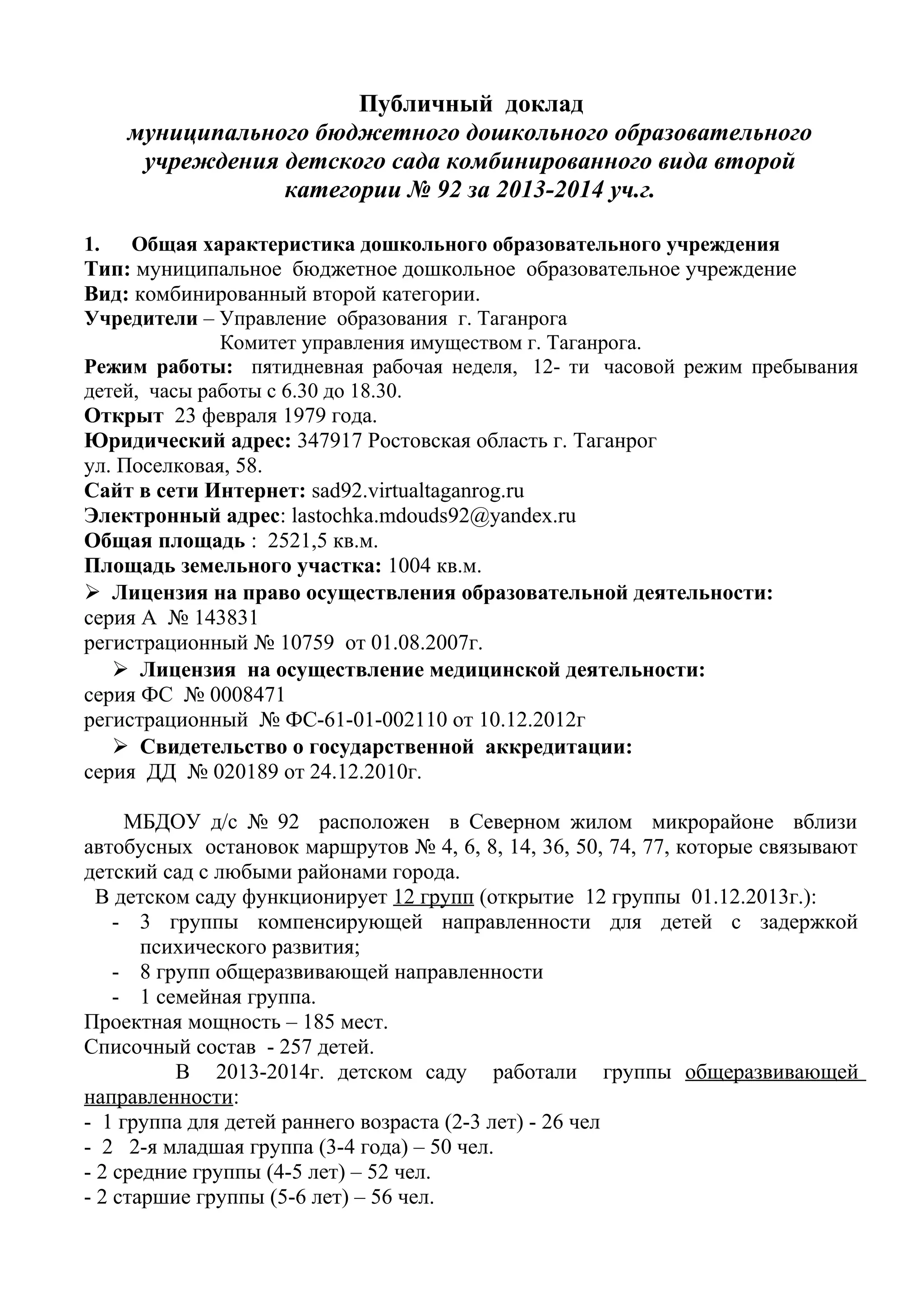 Доклад описывает муниципальное бюджетное дошкольное образовательное учреждение детского сада комбинированного вида no 92, предоставляющее услуги с 1979 года и имеющее 12 групп для детей с различными потребностями. Основные направления работы включают коррекцию недостатков в развитии, развитие коммуникации и познавательных навыков, а также поддержку здорового образа жизни детей. В 2013-2014 учебном году в детском саду было зачислено 257 детей, педагогический состав составляет 28 специалистов, а финансирование учреждения достигло 20,6 миллиона рублей.