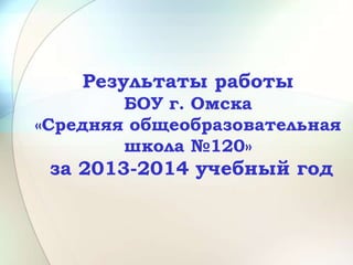 Документ содержит отчёт о деятельности бюджетного общеобразовательного учреждения "Средняя общеобразовательная школа No120" города Омска за 2013-2014 учебный год, включая данные о количестве обучающихся, кадровом составе и образовательных результатах. В отчете представлены показатели успеваемости, результаты ОГЭ и ЕГЭ, а также достижения учеников в олимпиадах и конкурсах. Указаны динамика учащихся и кадровые изменения, включая информацию о квалификации учителей и их опыте работы.