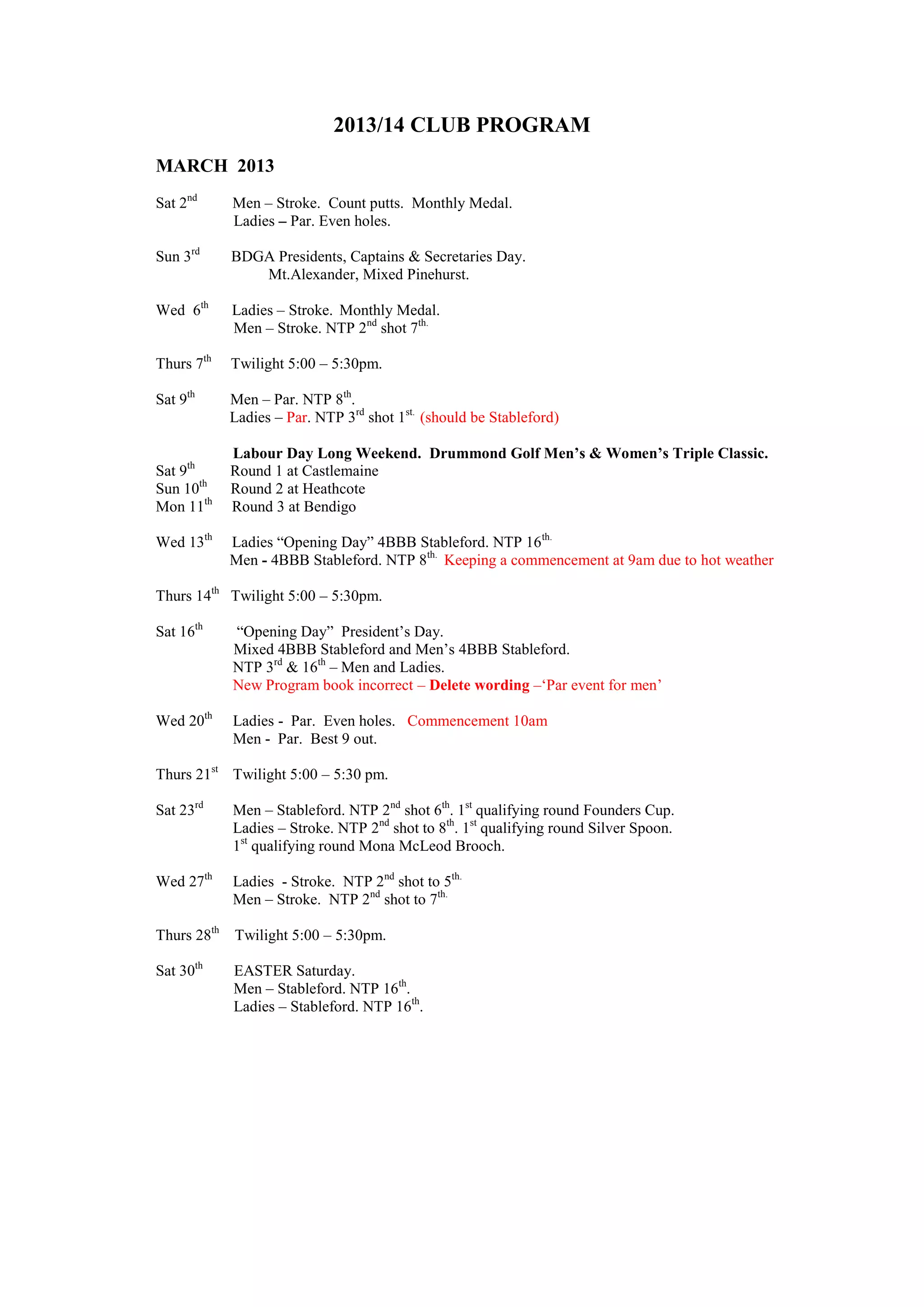 The document provides the club program for the Bendigo Golf Club for March 2013 through November 2013. It lists the scheduled events for each date, including competitions, pennant matches, and social events. Key events include the opening day celebrations in March, club championships in July, pennant finals in September, and the conclusion of the season in November.