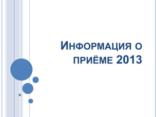 Документ содержит информацию о приёме в лицей в 2013 году, включая устав, образовательные программы и особенности подготовки учащихся. Указаны условия зачисления, вступительные испытания, а также требования к документам для поступления. Лицей предлагает углубленное обучение и возможности для развития индивидуальных творческих способностей.