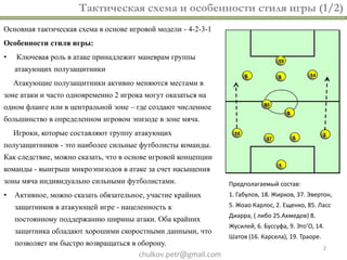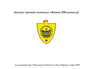 Документ анализирует тактику футбольной команды 'Анжи' на основе матчей в чемпионате России и Лиге Европы в марте 2013 года. Основное внимание уделяется тактической схеме 4-2-3-1, индивидуальным особенностям игроков, а также стратегии перехода из обороны в атаку. В документе также рассматриваются альтернативные схемы, а также варианты противодействия соперников в зависимости от игровых ситуаций.